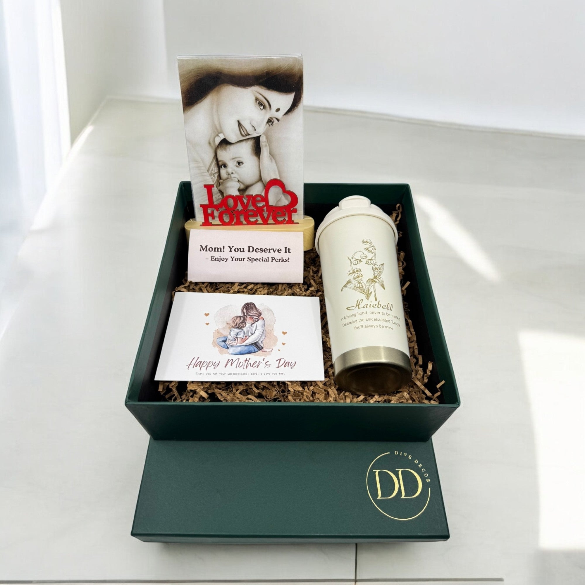 A beautiful way to honour the most special woman in your life, this thoughtful Mother's Day gift set is filled with love and appreciation. The Customised Love Forever photo frame captures cherished memories, creating a keepsake she ll treasure. A stylish sipper adds a practical yet elegant touch perfect for her daily routine. The heartfelt Women Card expresses gratitude while a special coupon brings an extra element of joy. Thoughtfully designed this meaningful set is a perfect way to make Mum feel truly loved and cherished.