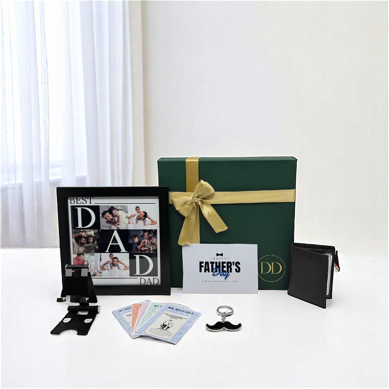 Show Dad he's truly one of a kind with Dive Decor Ultimate Dad Packa thoughtfully curated hamper packed with practical and heartfelt gifts. It includes a personalised photo frame to showcase treasured memories a fun Dad love coupon booklet a stylish wallet a classic keychain a premium stainless steel mobile holder and a heartfelt Fathers Day card. Designed to suit every kind of dad this set blends utility with sentiment making it the perfect way to express your love and appreciation this Fathers Day. A gift hell cherish and use every day.